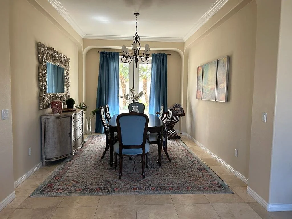 The dining room also had the same look and feel as the living room. We decided we'd use different styles of chairs for the host and hostess chairs. We had them custom-made with a performance fabric that is both durable and easy to maintain, while incorporating details with cording to enhance the overall look and feel. The side chairs are a Queen Anne style. The sideboard/buffet features a contrasting finish to the wood of the table and chairs. We added a classic-style mirror with an intricate design in a silver finish, which is continued in the frame of the abstract art on the opposite wall. The rug was the inspiration for this room, from which the entire color scheme for the room was created.