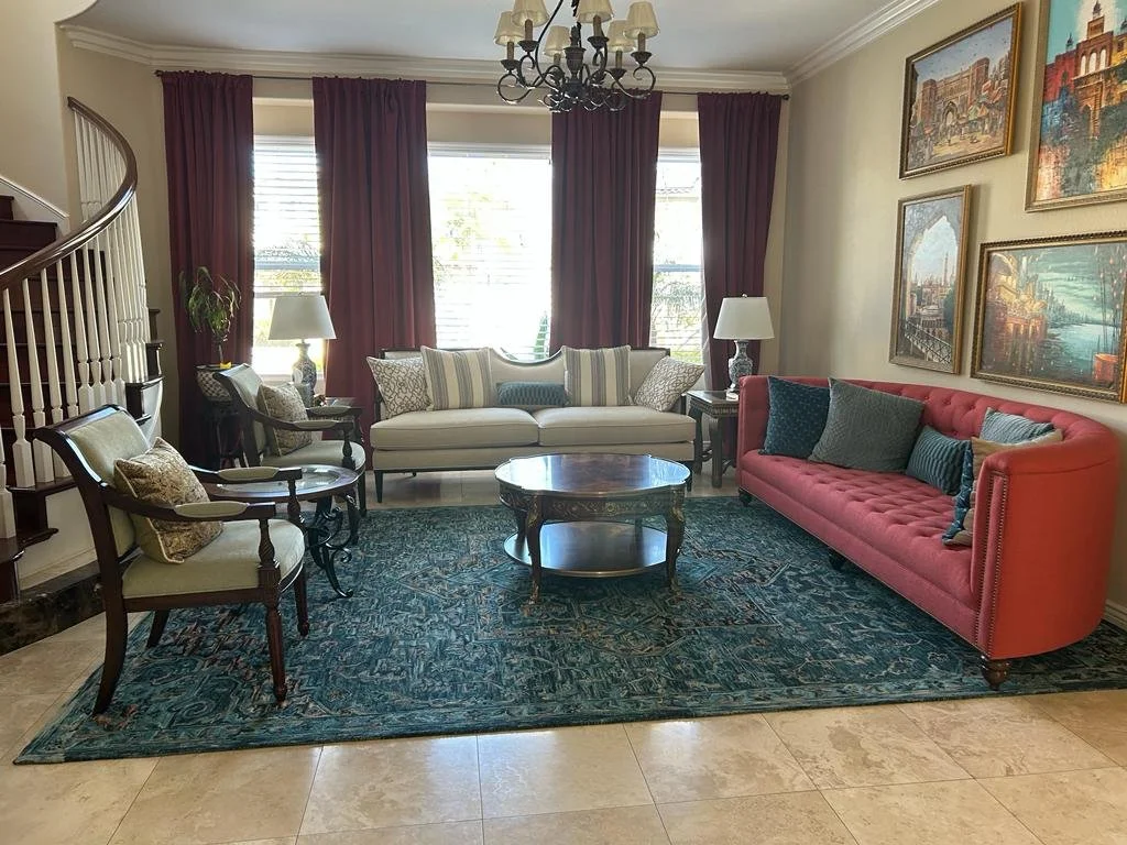 The clients' traditional armchairs fit perfectly with an accent table with a clock dial. The light green upholstery picked up the green from the vibrant green rug. The curved orange sofa picks up the color from the beautiful artwork and the floor-to-ceiling drapes. The neutral-colored sofa with the wood detail with a sleek look, stayed true to the end result we were working to achieve. The finish of the frames for the art is continued in the beautiful wood coffee table with carved details.