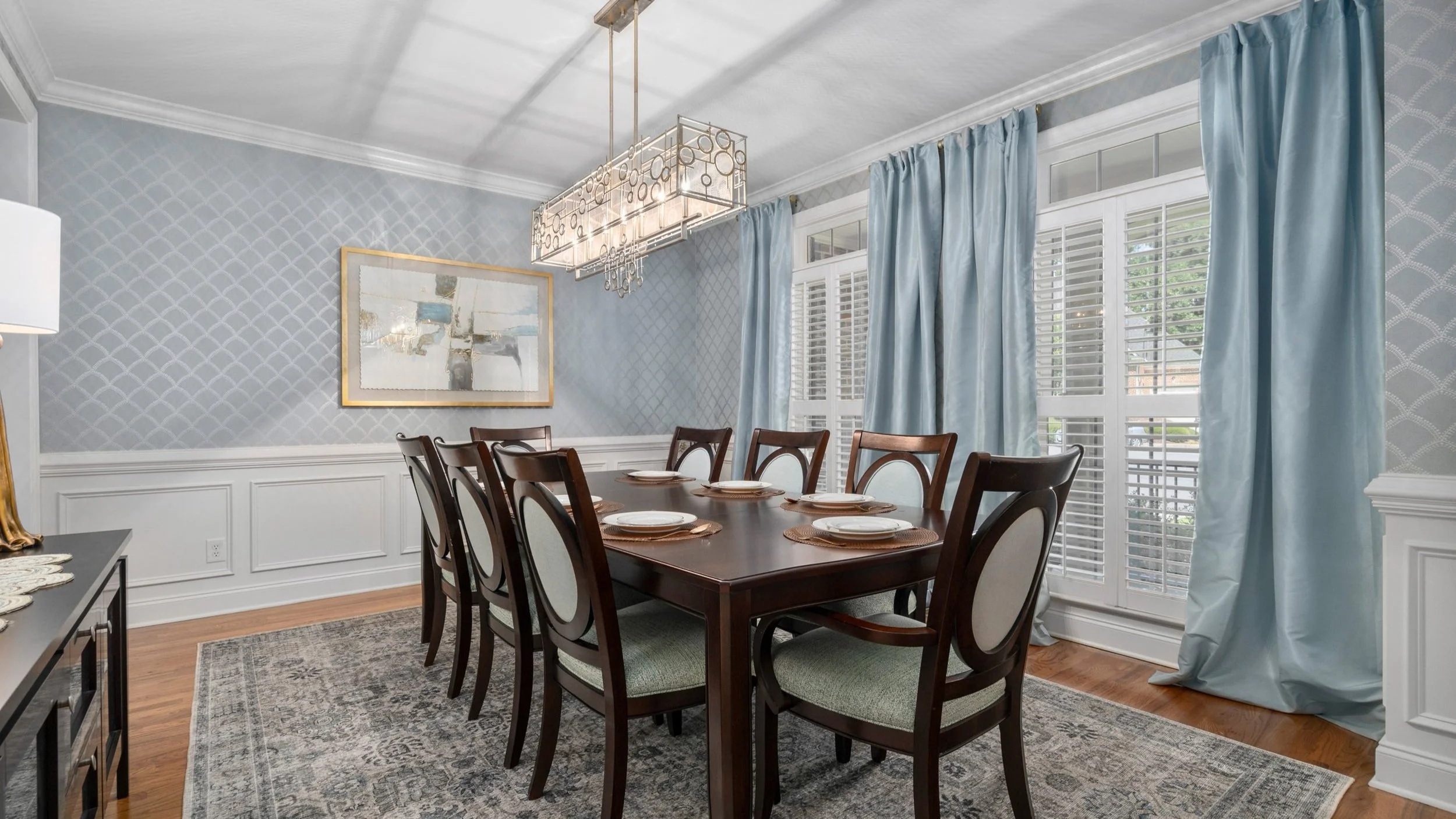 A home that balances grace and comfort through refined layers of pattern, color, and light. From the soft shimmer of silk drapery to the warmth of brass accents, every detail works in harmony to create a timeless yet inviting atmosphere.